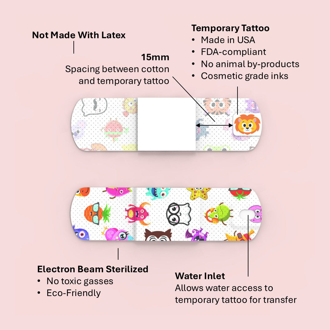Finally, a bandage your toddler wants to take off. When it's time to remove the bandage, just use water and pressure to soften the adhesive while transferring the integrated temporary tattoo. With Brandage brand adhesive bandages, peeling off bandages isn't scary - it's fun!